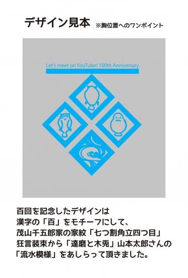 漢字の「百」をモチーフにして、茂山千五郎家の家紋「七つ割角立四つ目」狂言装束から「達磨と木兎」山本太郎さんの「流水模様」をあしらって頂きました。